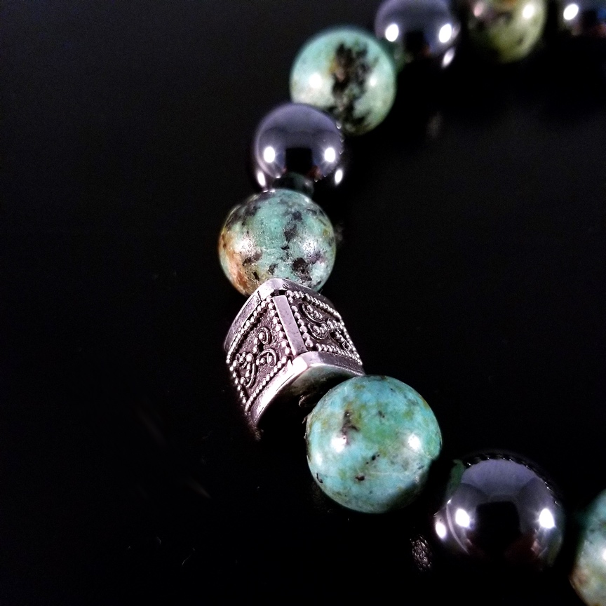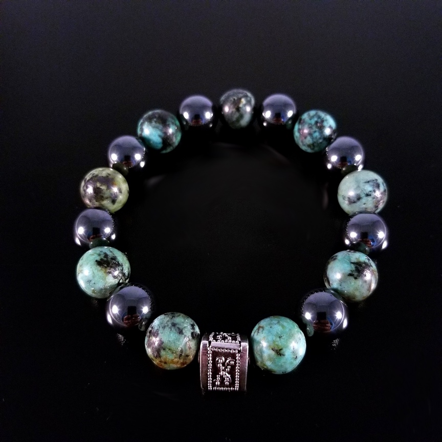 African Turquoise is actually a form of Jasper or Chalcedony. Its beautiful green-blue earth tones make this a very versatile bracelet. The large 12mm beads combined with Hematite also make it a very masculine piece of jewelry.